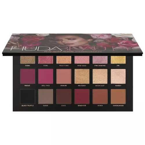 پالت سایه هدی بیوتی رزگلد HUDA BEAUTY ROSE GOLD دارای ۱۸ رنگ شگفت انگیز می باشد که دارای فرمولاسیون درخشنده و صاف میباشد. این پالت شامل ضروری ترین رنگ هایی است که به صورت روزمره نیاز دارید. این محصول  اورجینال با بهره گیری از رنگدانه های قوی ،ترکیبی از ۱۸ رنگ در چهار بافت اصلی است. که شامل هشت سایه مات کرم گونه، هشت سایه متالیک، یک سایه مشکی که می توان آنها را مرطوب یا خشک استفاده کرد و یک سایه مرواریدی فشرده است.